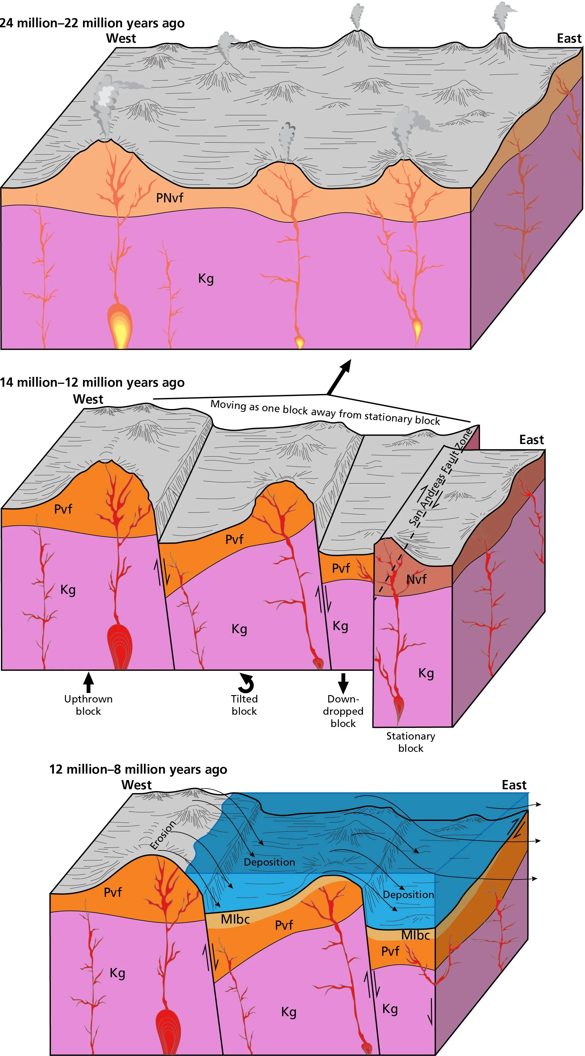 3-D block diagrams showing the geologic evolution of western California. Credit: Thornberry-Ehrlich (2022)